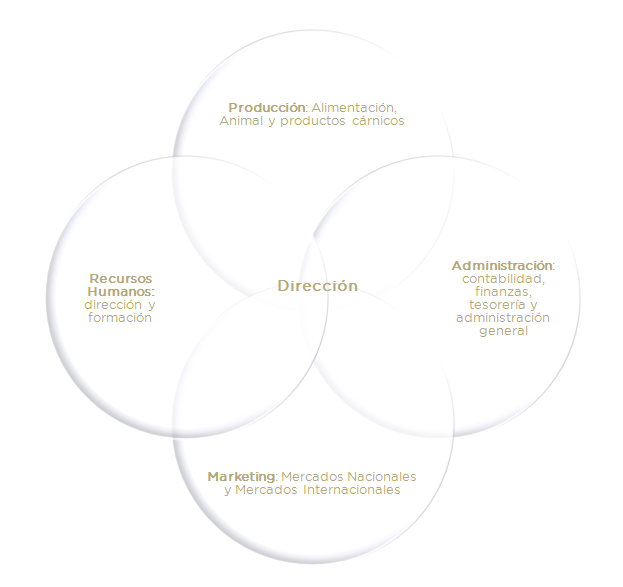 Casaseca Meat Group se organiza bajo una agrupación por funciones que se desarrollan en una serie de subfunciones. Las subfunciones pueden ser desarrolladas por nuestra empresa o en colaboración con empresas externas, pero posteriormente, siempre son integradas y absorbidas por la función interna de la que dependen.